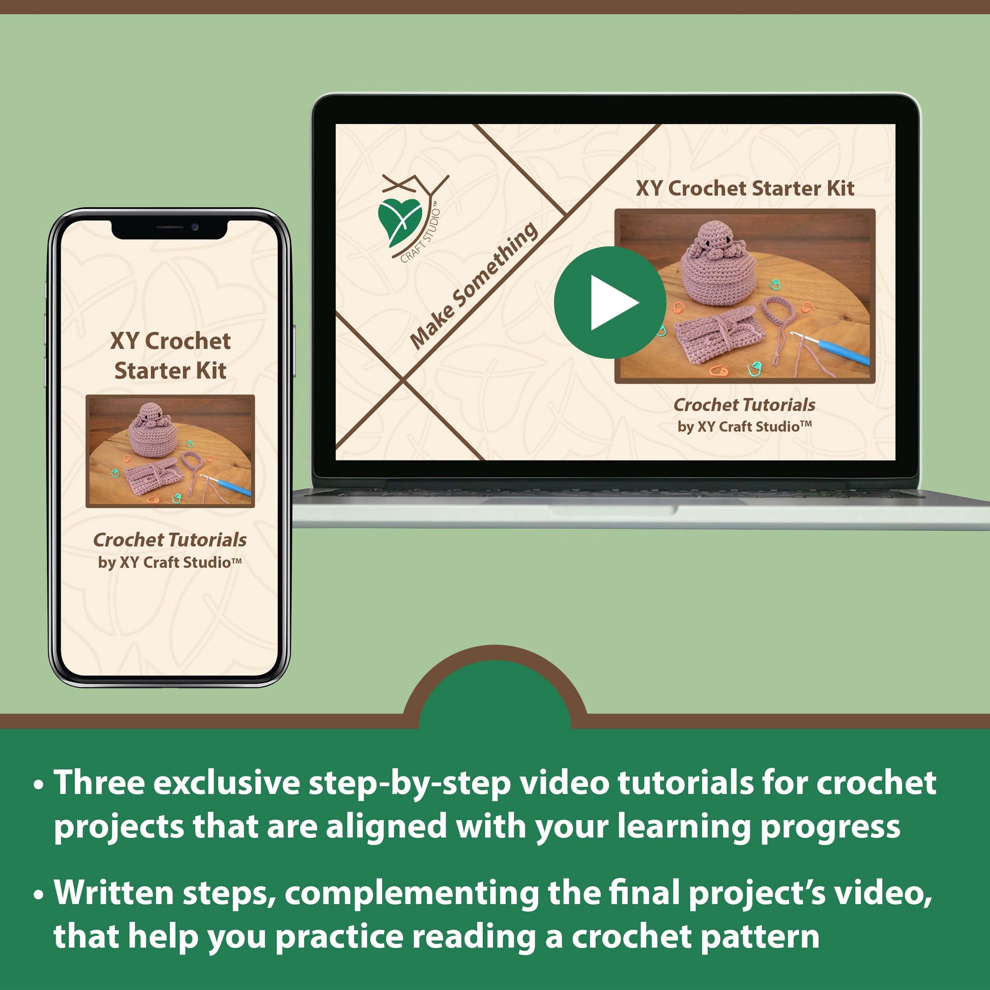 The kit includes video tutorials, a detailed guide, essential tools and materials, and exclusive projects to get first-time crocheters started. More details below.
